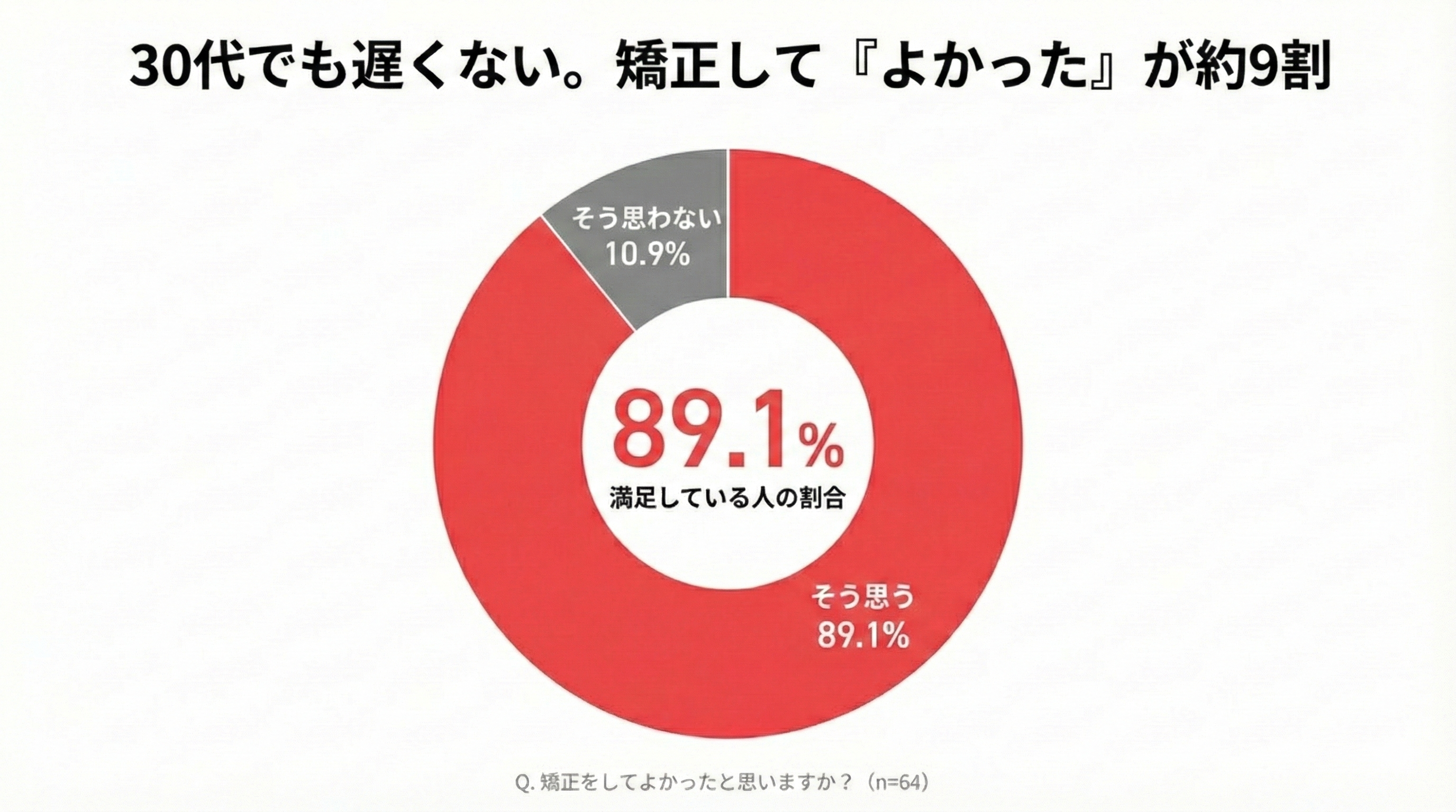 実際にOh my teethが行った、30代で5年以内に矯正を終えた64名へのアンケート調査では、約89.1%(57名)もの人が「矯正をしてよかった」とポジティブな回答を寄せています。