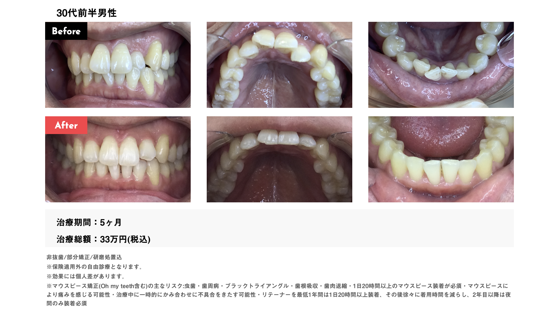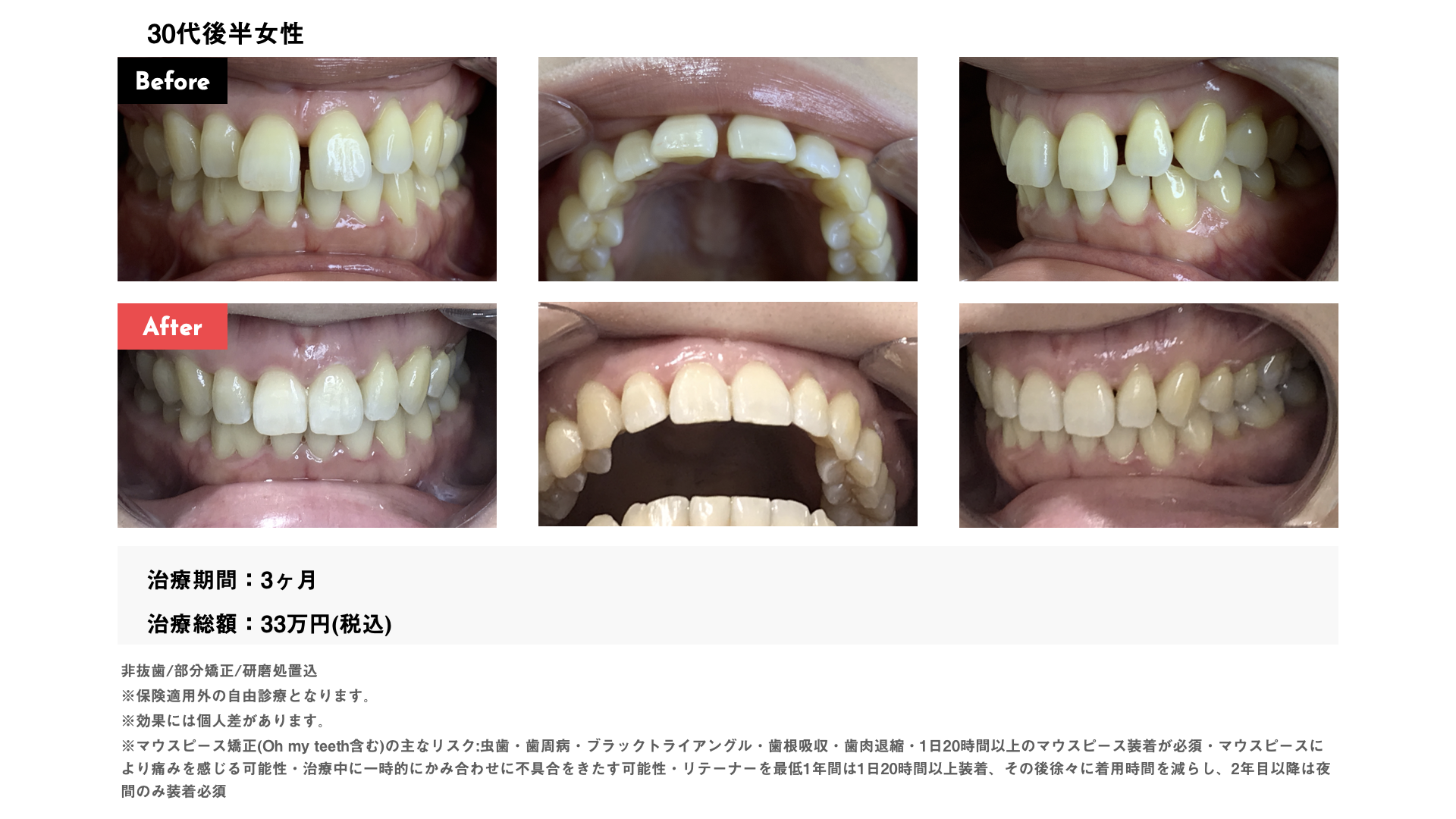 ここでは、30代からマウスピース矯正を始めた方の症例を紹介します。