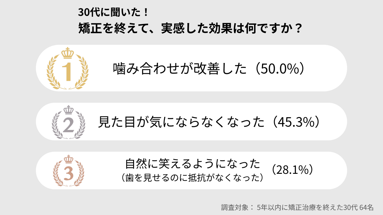 この結果からもわかるように、30代の矯正は単に見た目を整えるだけでなく、「機能面・健康面でのメリット」を強く実感できるのが特徴です。
