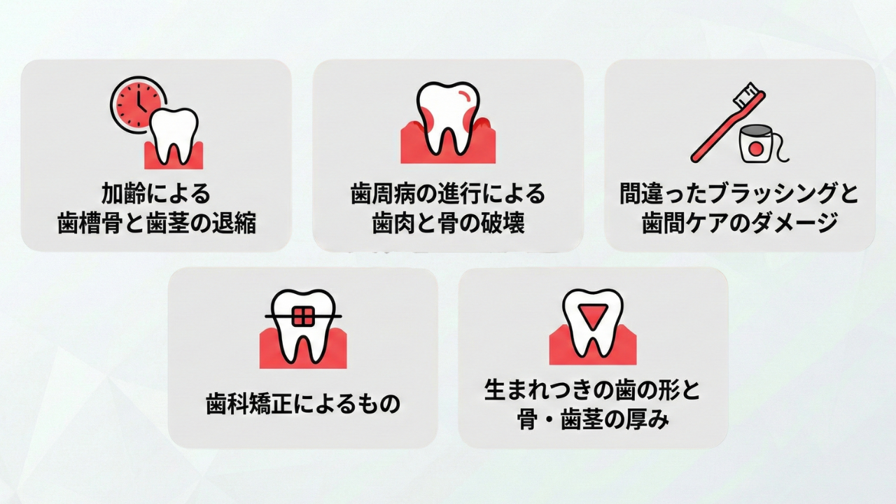 - 原因①:加齢による歯槽骨と歯茎の退縮