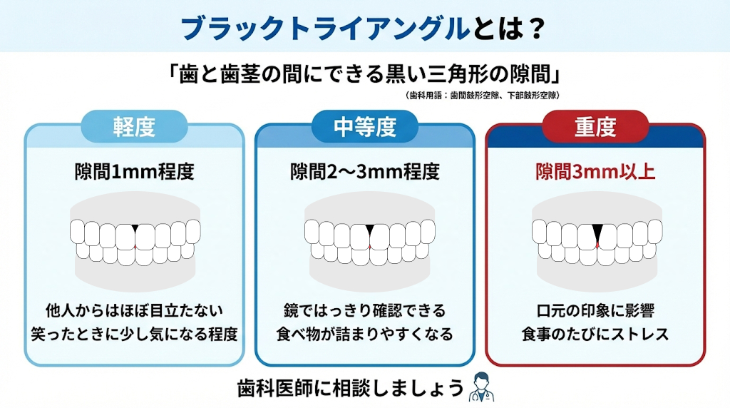 ブラックトライアングルとは、歯と歯茎の間にできる三角形の隙間のことです。見た目だけでなく食べ物が詰まりやすくなる原因にもなります。