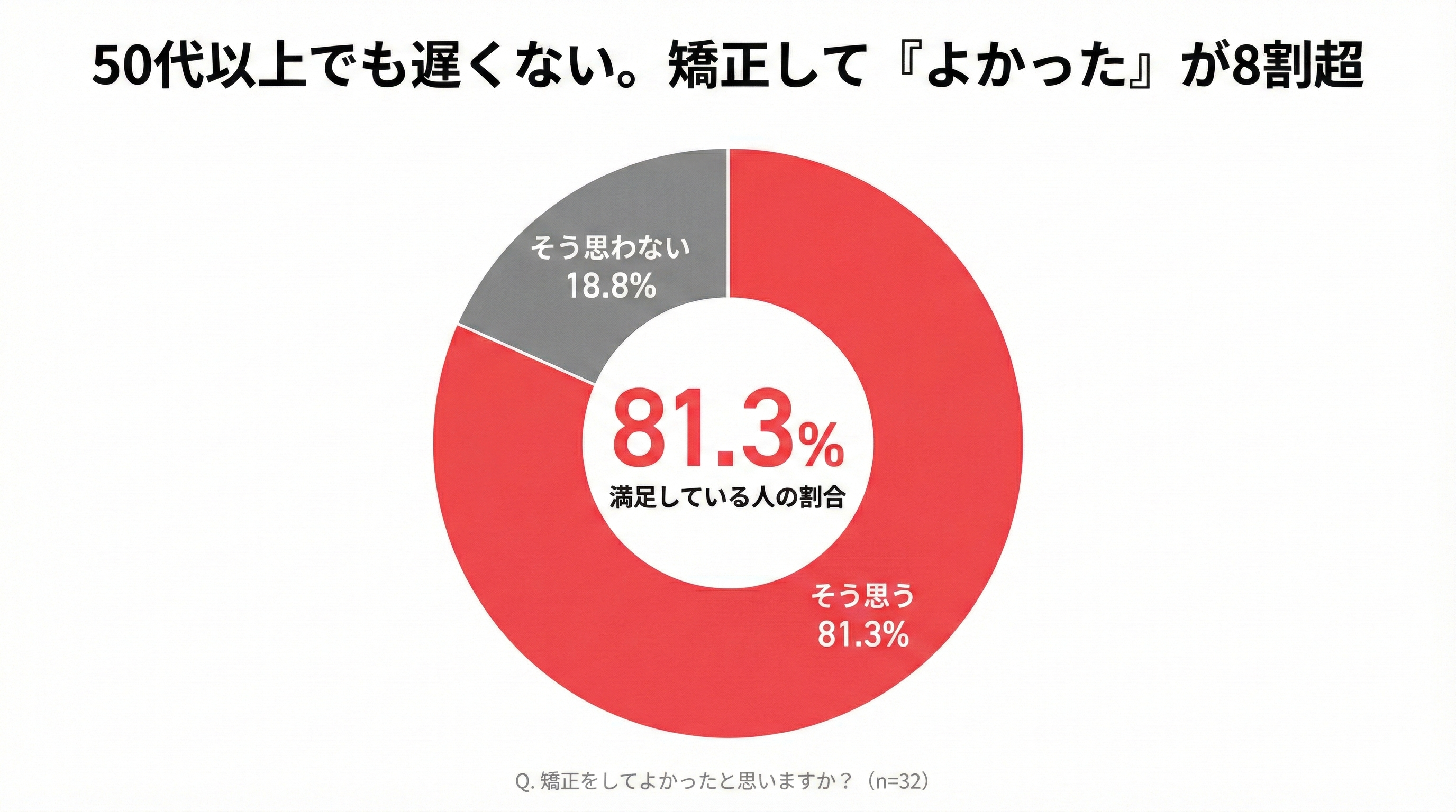 Oh my teethが実施した独自アンケートによると、50代以上の矯正経験者の81.3%が「やってよかった」と回答しています。
