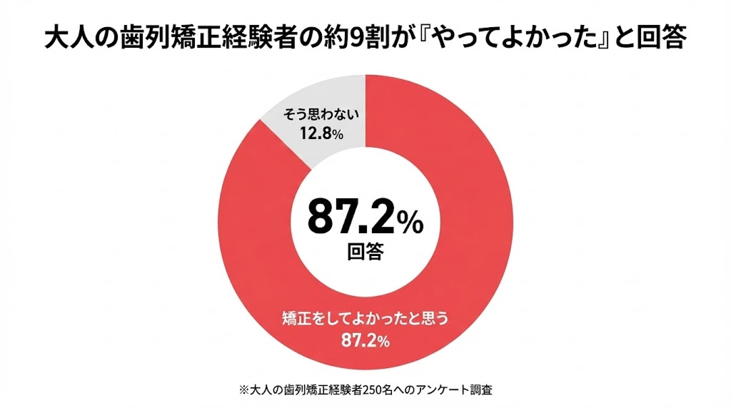 アンケートの結果、「矯正をしてよかったと思いますか?」という質問に対し、87.2%の人が「そう思う」と回答しました。
