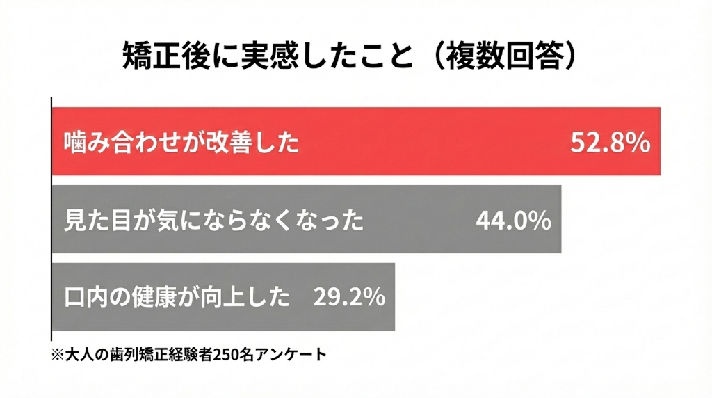 一般的に歯列矯正というと「見た目をきれいにするもの」というイメージが強いですが、実際には半数以上の人が「噛む機能の向上」を実感しています。