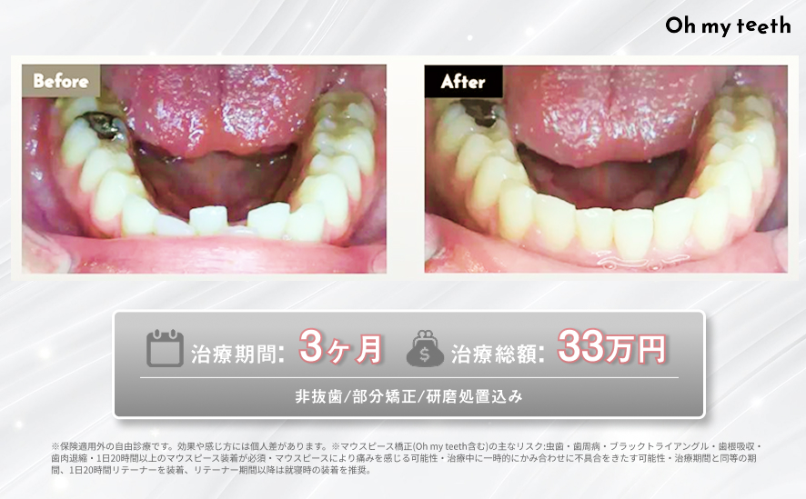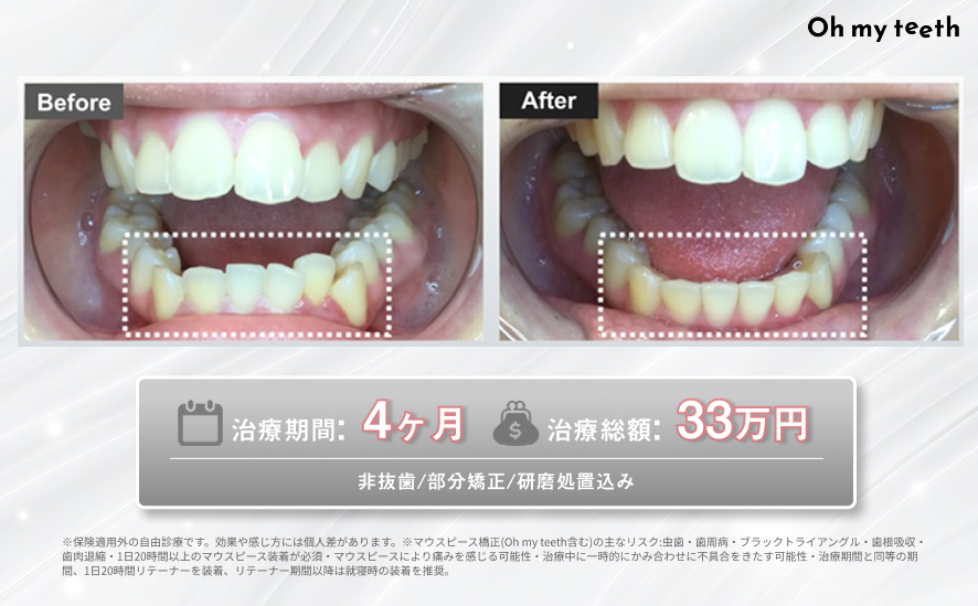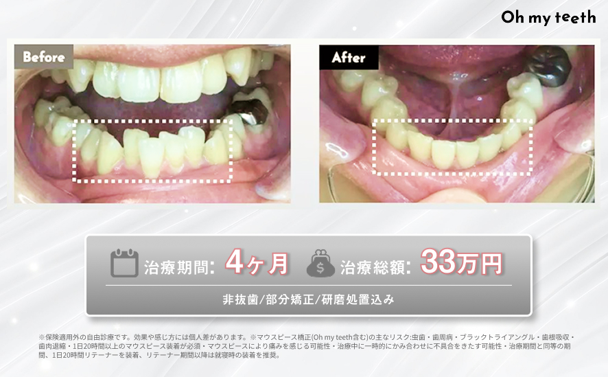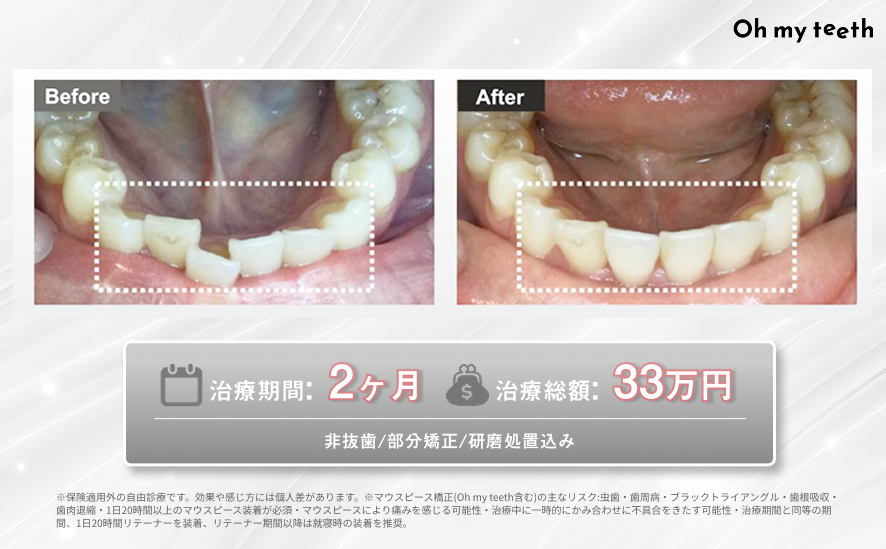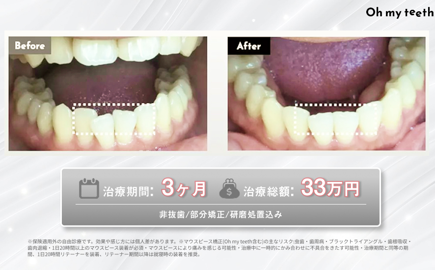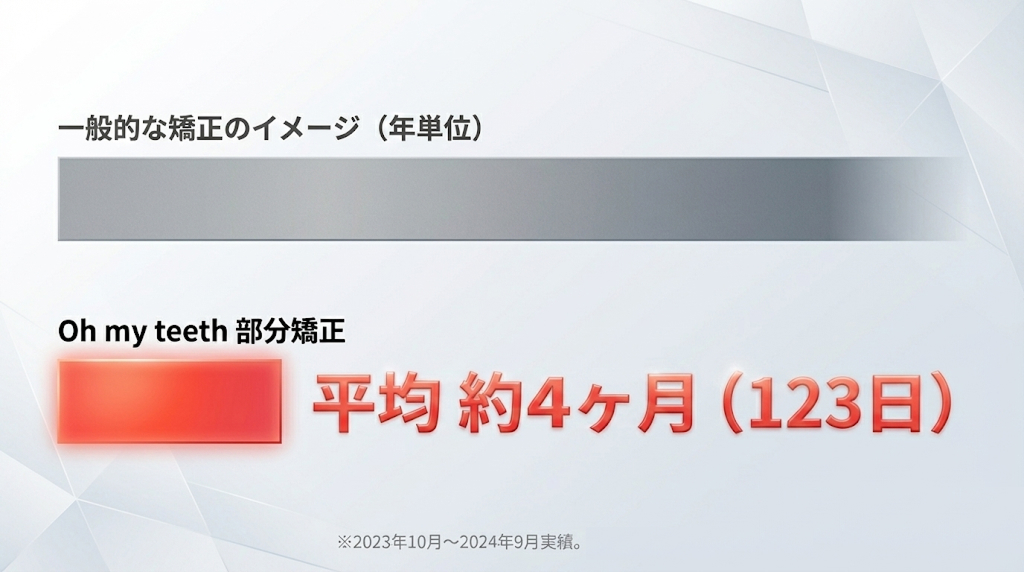なお参考として、Oh my teethの部分矯正で2023年10月〜2024年9月に治療を終えたユーザーの平均矯正期間は123日(約4ヶ月)でした。軽度であれば2ヶ月程度で終わる症例もあるので、まずは無料診断にお越しください。