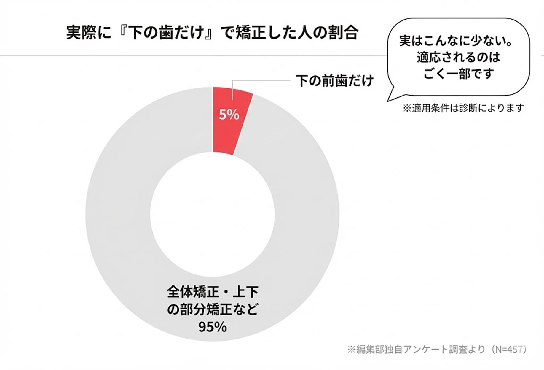 - 【独自アンケート】「下の歯だけ」を矯正した人の割合は5%。ただ、部分矯正で治療した人の割合は高い。