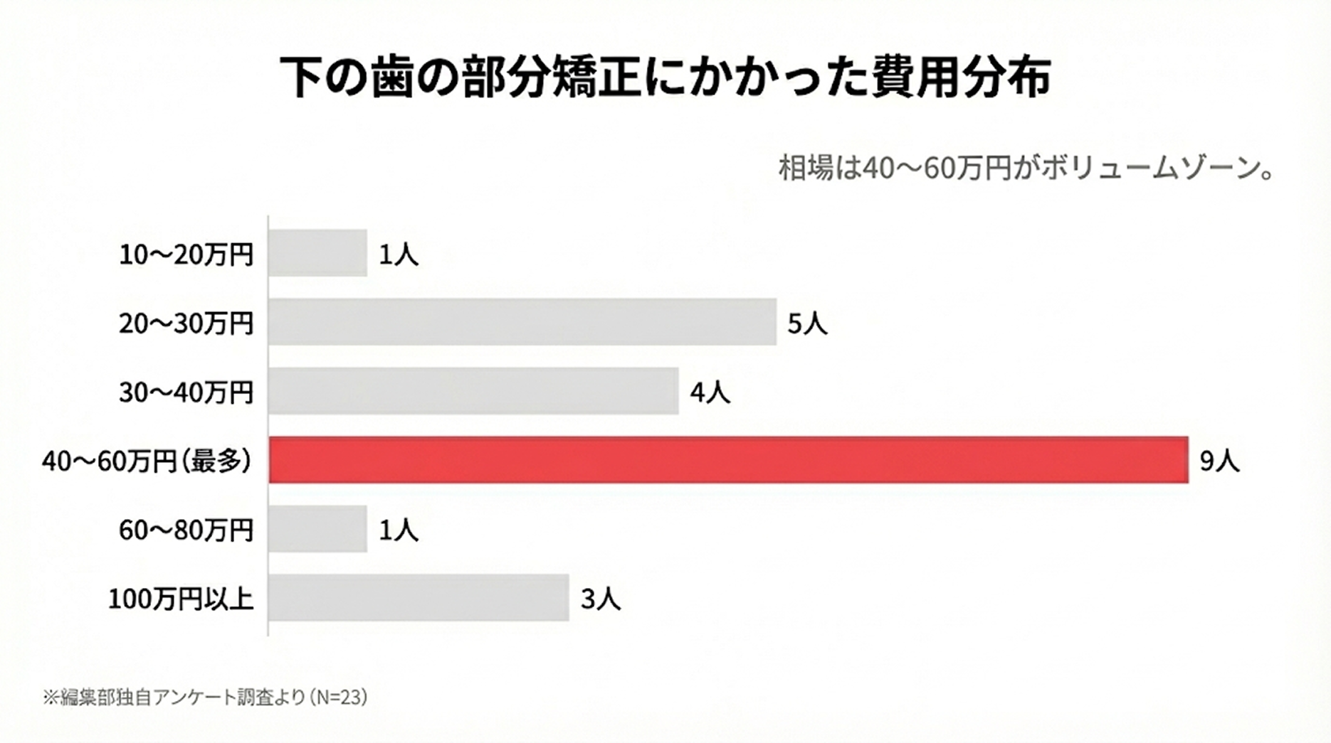 - 下の歯だけを矯正した人の費用相場は「40〜60万円」が最多。